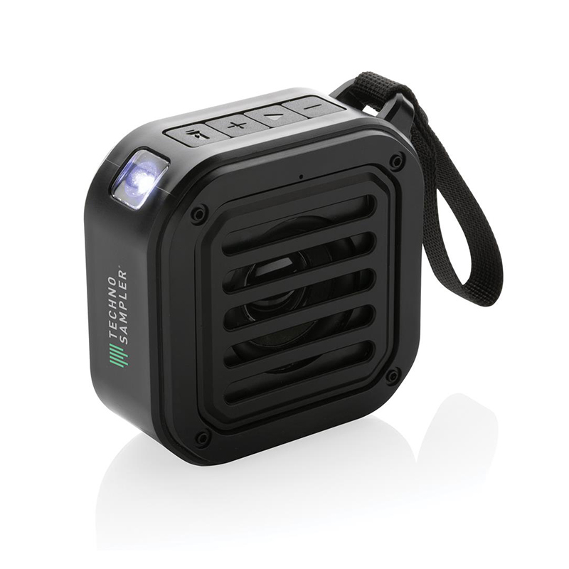 Dieser kabellose Lautsprecher mit integriertem Solarpanel besteht aus recyceltem ABS. Die 400-mAh-Batterie bietet bis zu 5 Stunden Spielzeit. Mikrofon und Anruf-Funktion sind ebenfalls enthalten. Zudem ist der Lautsprecher wasserfest – ideal als praktisches Werbegeschenk!