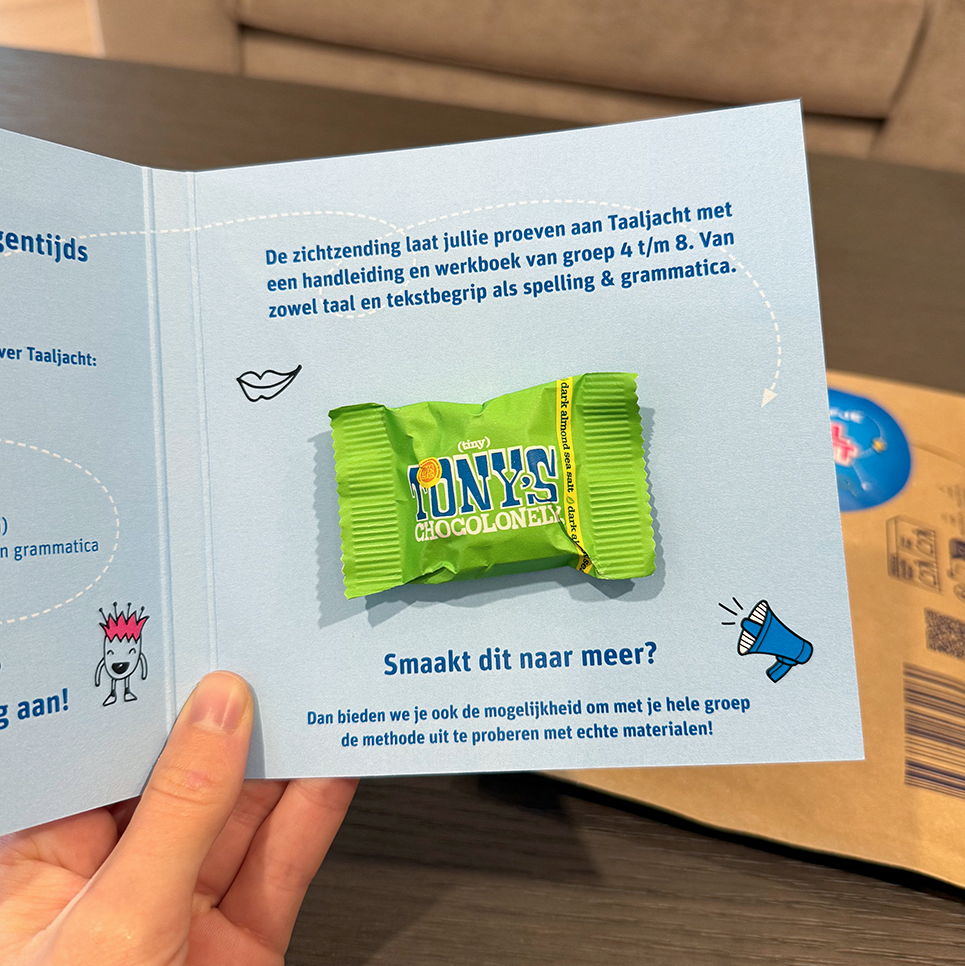 Die Stärke eines Werbegeschenks liegt nicht in seiner Größe, sondern in der Aufmerksamkeit, die ihm gewidmet wird. Das zeigen die Briefkasten-Pakete, die wir mehrfach für Uitgeverij Zwijsen umgesetzt haben. Für Schulen in den gesamten Niederlanden stellten wir nachhaltige Pakete mit Karten, Broschüren und kleinen Aufmerksamkeiten zusammen. Beispielsweise Samenkonfetti, eine Karte mit einem Tiny Tony oder ein Keks von De Koekfabriek. Alles wurde sorgfältig ausgewählt, in FSC-zertifizierten Umschlägen verpackt und mit einem vollfarbig bedruckten Verschlussaufkleber versehen. Kompakt, aber vollständig.