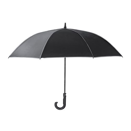 Dieser windbeständige Regenschirm besteht aus robustem RPET-Pongee, hergestellt aus recycelten PET-Flaschen. Mit seinem eleganten schwarzen Design und den reflektierenden Details fällst du selbst bei grauem Regenwetter auf. Der Schirm öffnet sich automatisch, hat einen Durchmesser von 120 cm (27") und verfügt über stabile Fiberglasstreben sowie einen Griff aus PP. In der mitgelieferten Hülle mit verstellbarem Gurt und Klettverschluss lässt er sich einfach transportieren.