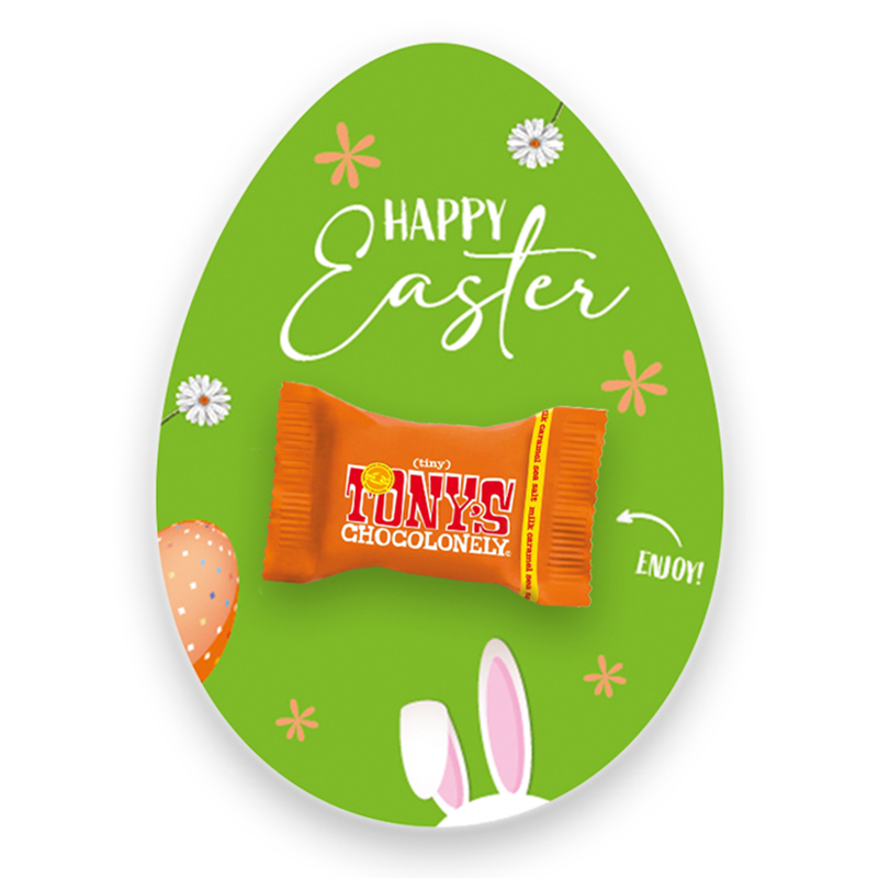 Sie möchten zu Ostern eine wirklich originelle Karte verschicken? Diese ist definitiv ein Hit! Die Karte ist wie ein Osterei geformt und kann auf der Vorder- und Rückseite mit Ihrem eigenen Design bedruckt werden. Auf der Karte klebt auch eine köstliche Schokolade von Tony's Chocolonely.