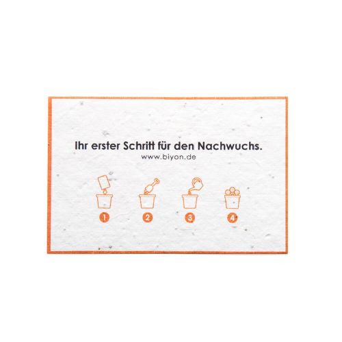 Die Visitenkarten bestehen aus stabilem 200 gr./m2* Saatpapier und können mit Ihrem individuellen Design im hochwertigen Vierfarbdruck bedruckt werden. Saatpapier-Visitenkarten sind bereits ab 250 Stück erhältlich – eine nachhaltige und originelle Art zu netzwerken.