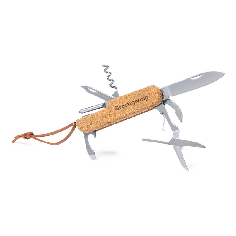 Eigentlich kann jeder ein solches multifunktionales Taschenmesser gebrauchen. Deshalb ist es ein perfektes Geschenk für Mitarbeiter oder Kunden. Das Taschenmesser hat 9 Funktionen, darunter Messer, Öffner, Schere, Feile und Schraubendreher. Der Griff ist wunderschön mit Kork veredelt. Am Taschenmesser befindet sich außerdem eine Lederkordel zum Aufhängen.